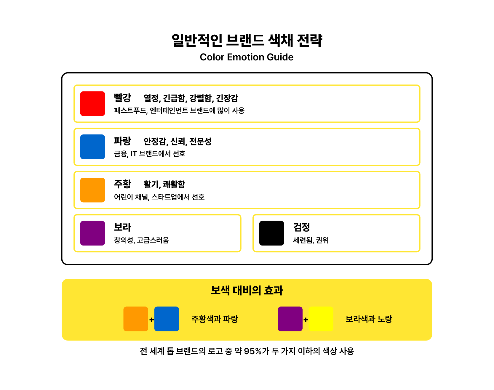 브랜드에서 사용하는 색채 대비는 무의식적으로 소비자의 뇌에 깊이 새겨져 브랜드를 인식하고 감정적으로 연결짓게 만듭니다. 그렇기에 기업들은 각자 브랜드 개성에 부합하는 색을 전략적으로 선택해 왔습니다.